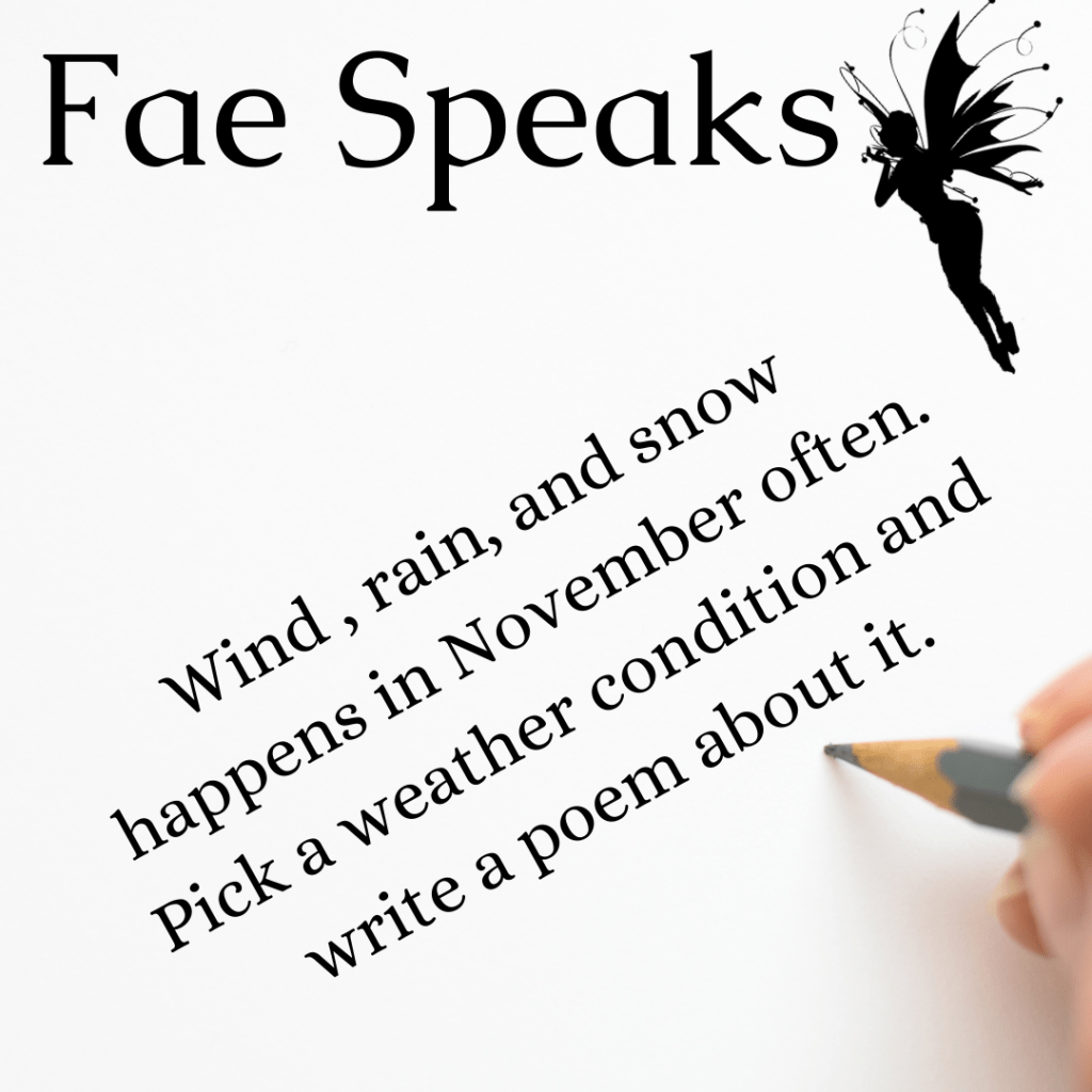 Your choice of form, This can be broad, or specific. Some examples of weather conditions are Rain, Hurricane, Wind, Tornado, Snow, Sunshine, Hail, Sleet, Ice, floods, Tsunami, Tropical storm. there are more I am sure…but those are just what comes to mind. There is no right or wrong topic, this is just suggestions to spark your muse.