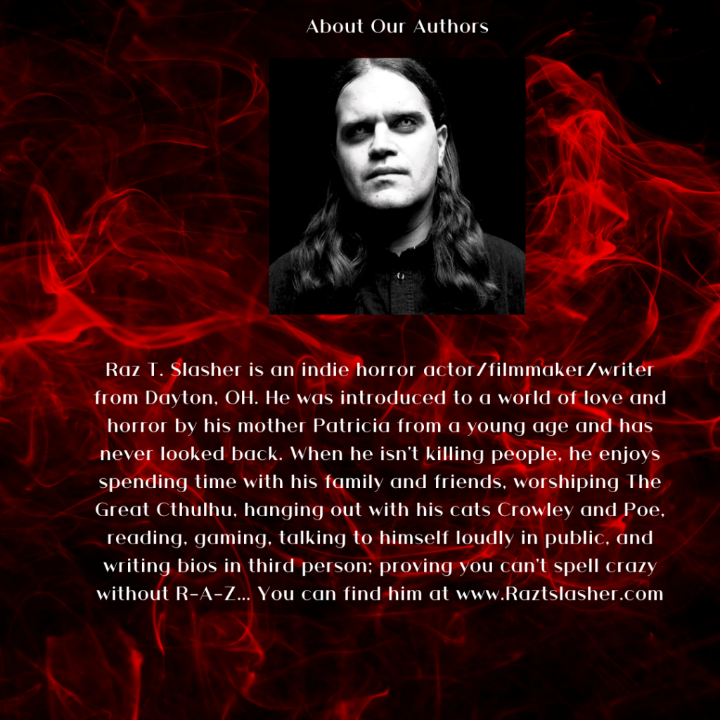 Dr. Raz T. Slasher having gotten an Honorary Doctorate of philosophy in popular culture is one of our favorite authors. He has been in most of our anthologies and has now published 4 separate books with us. Instead of listing everything he has been in I will direct you to his reading list…and the channel of his Network on Youtube. For other updates check out his website!