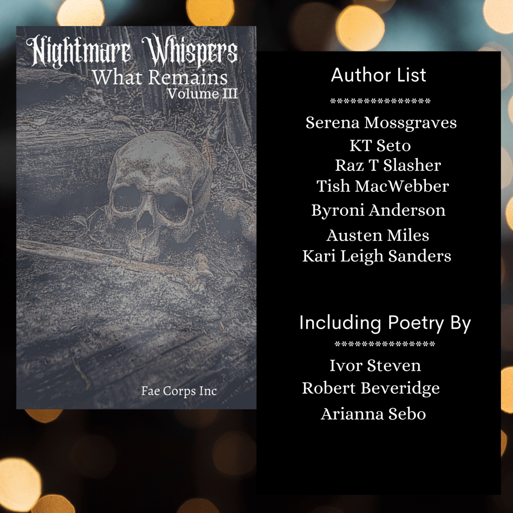We are pleased to announce the Authors involved in the Nightmare Whispers Anthologies. There are a couple of Artists who due to circumstance was given a delayed deadline till the 7th. So this list may fluctuate slightly (Two possible more people) Otherwise this is the lists. Look forward between now and their release on Halloween for more details! And Due to the sheer amount of Quality submissions we recieved we decided to do one more..Yeah I know that is why we did two volumes…But even with rejection letters sent we were still getting more in. So Fae Corps is announcing a third Nightmare Whispers. The final volume of horror stories under that Heading. Here is the cover. I will Share the Author List next Thursday as we are awaiting a couple of email confirmations. So Thursday next week I will share the final lists for all three.