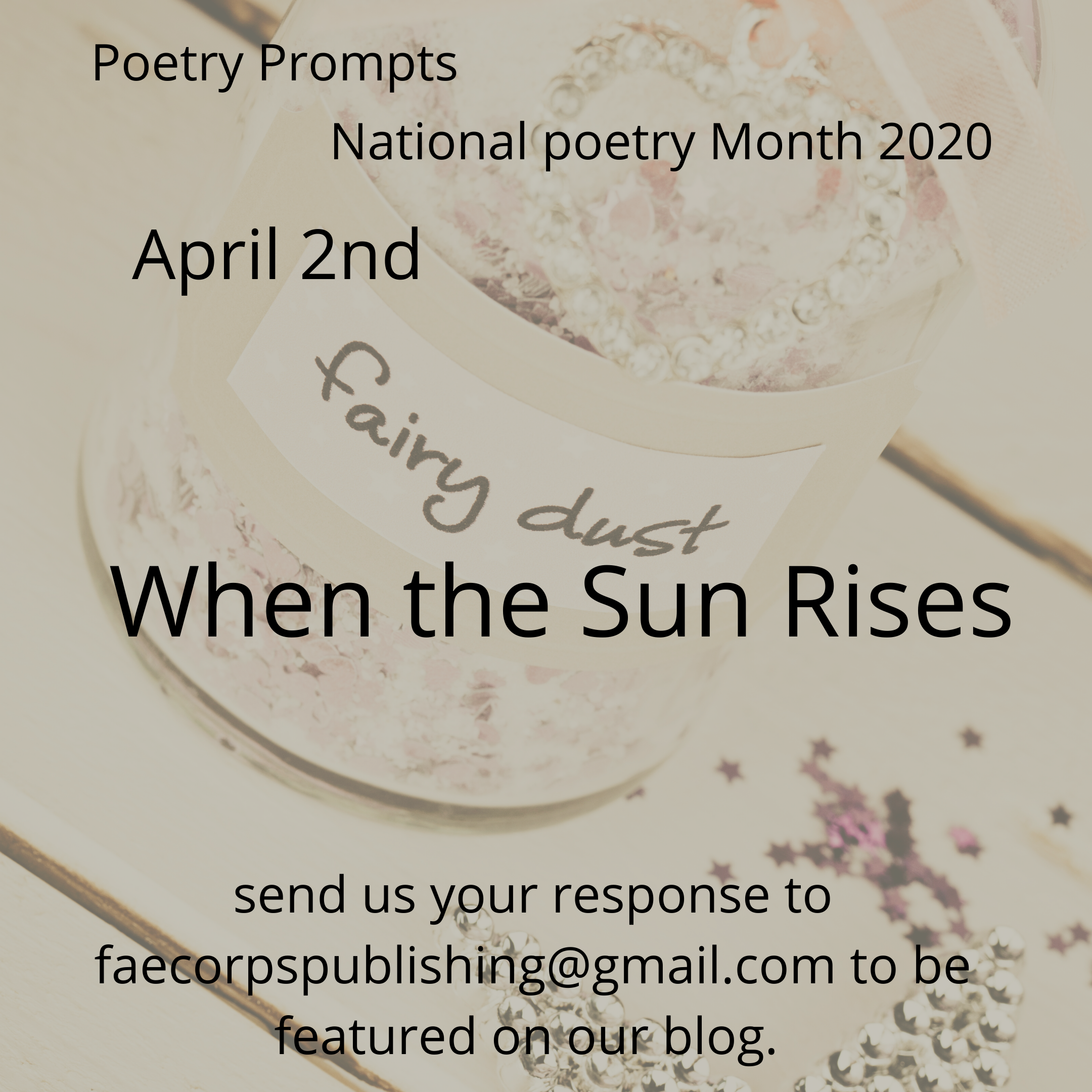 Apology for the lateness. We will be trying to do a daily prompt for National Poetry Month. If we miss any day expect us to catch up when we can. If you want us to feature your response… Email it to us. (Though we reserve the right to edit it and send it back to you if it needs it) we look forward to seeing all the wonderful ideas that flow from you.