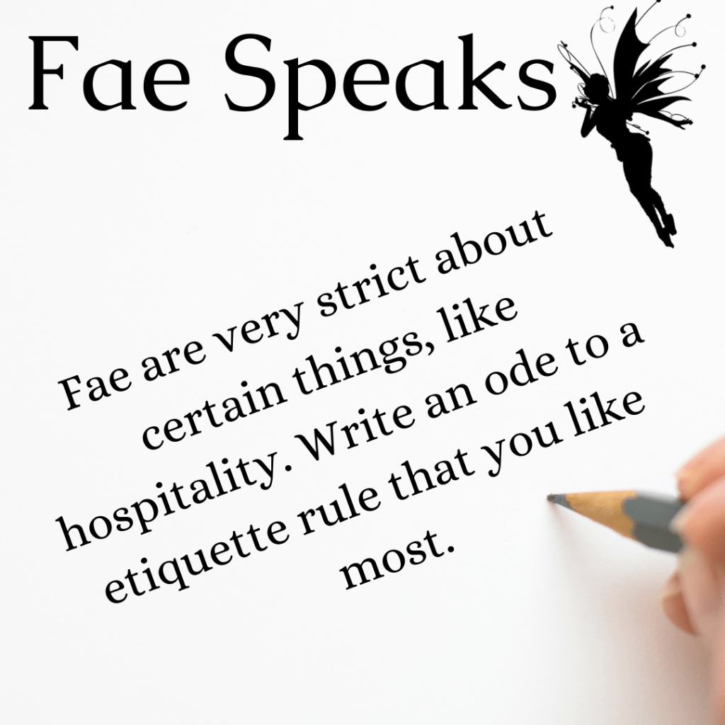 Failing to follow the rules of etiquette around the fae can arouse their anger. What etiquette rule do you most like? Write an ode to it. Can’t remember what an ode is? well here’s a link.
